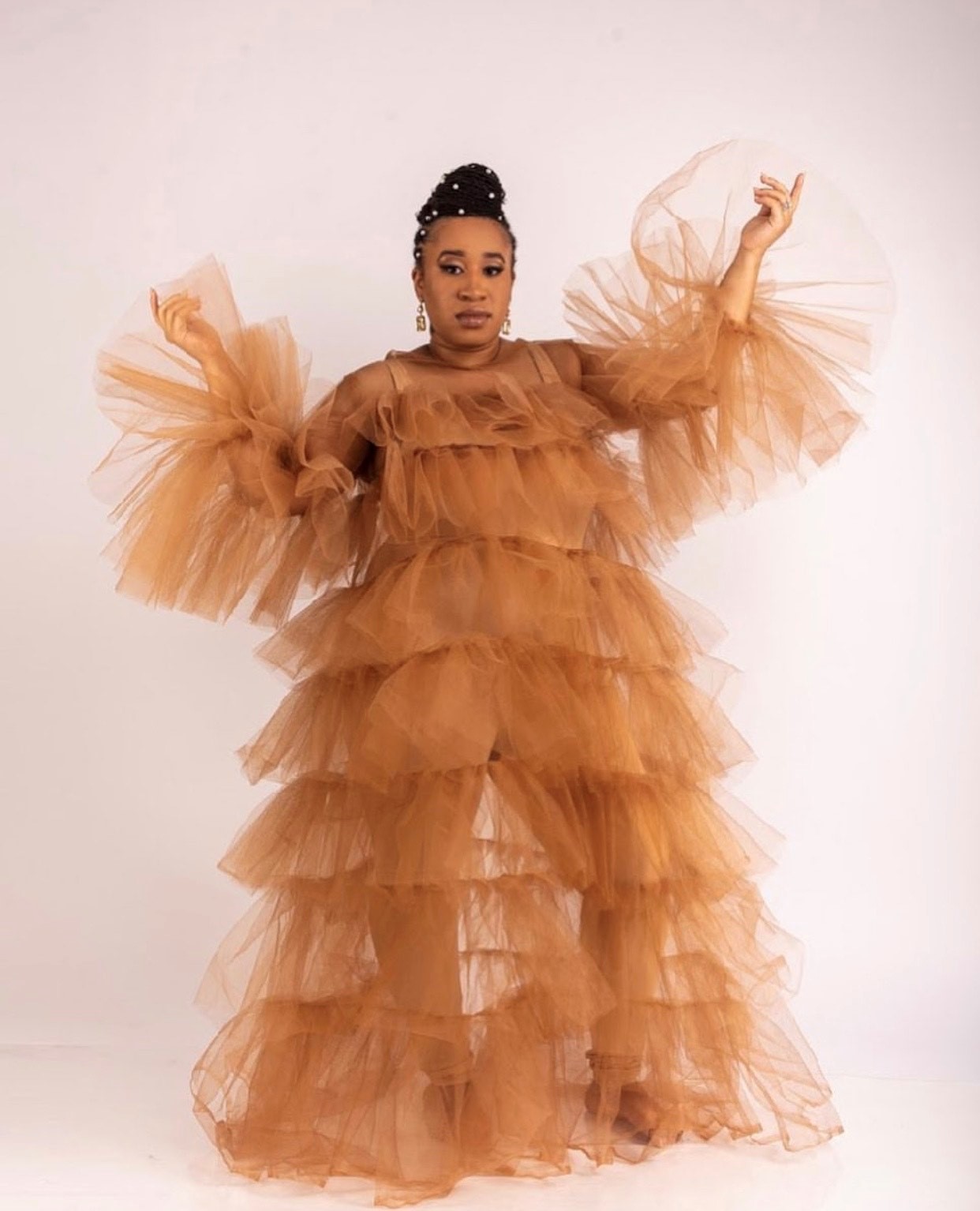 Long sleeve, layered free dress made with Tulle net/mesh. Nature Layered Long Dress is floor-length.